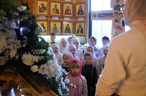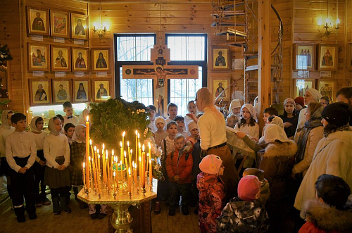 В хоре пели воспитанники Воскресной школы "Исток". Дети внимательно следили за ходом службы и с уверенностью исполняли Тропарь Рождества Христова и все основные песнопения праздничной обедницы под руководством регента Виктории Куликовой.
