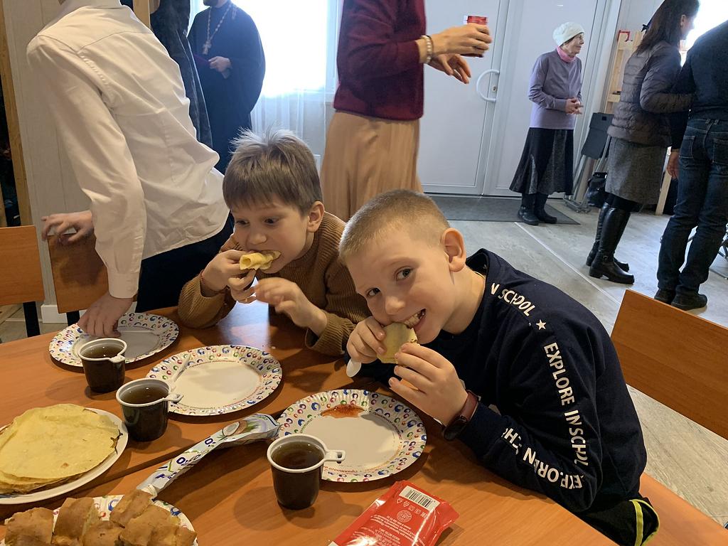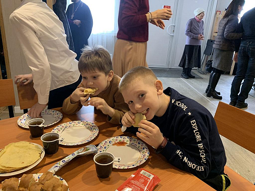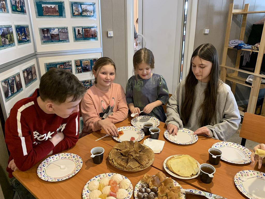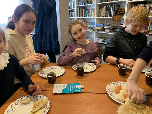 После викторины состоялось совместное чаепитие с блинами, вареньем и другими сладкими угощениями.