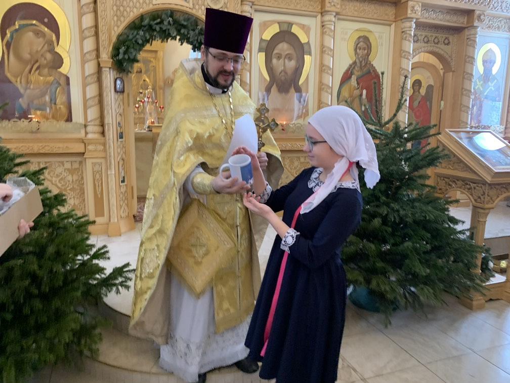Настоятель храма иерей Илия Власов торжественно вручил каждому ребенку сувенирную кружку с изображением предложенного на конкурс собственного рисунка.