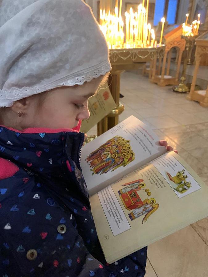 Во время богослужения дети следили за ходом службы по детской книге «Литургия»с пояснениями и наглядными картинками.