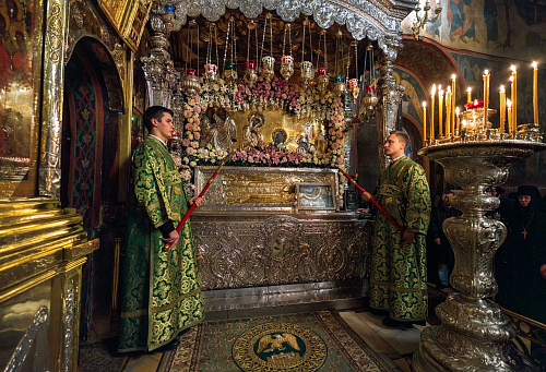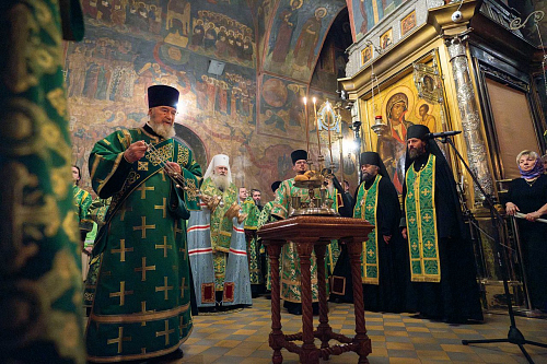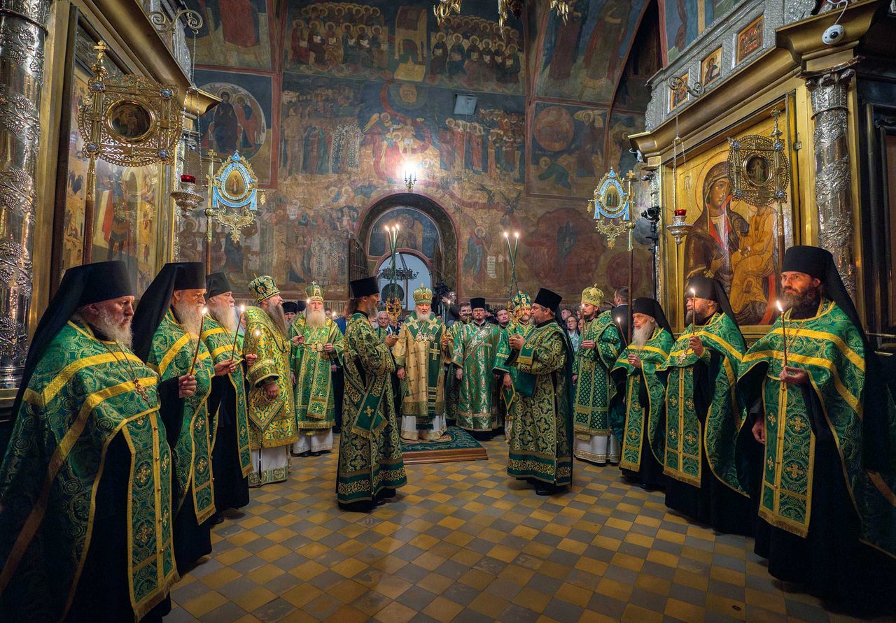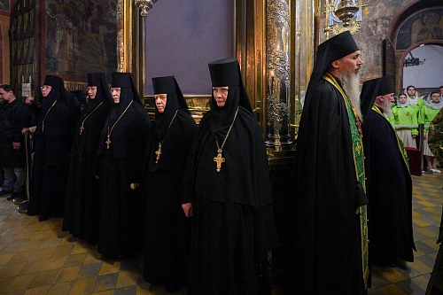 В храме молились архиереи, настоятельницы женских монастырей, священнослужители, монашествующие и паломники, прибывшие на торжества в лавру.