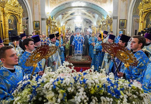 Его Святейшеству сослужили: митрополит Воскресенский Григорий, управляющий делами Московской Патриархии, первый викарий Патриарха Московского и всея Руси по г. Москве; митрополит Волоколамский Антоний, председатель Отдела внешних церковных связей Московского Патриархата; архиепископ Одинцовский и Красногорский Фома, руководитель Административного секретариата Московской Патриархии, настоятель Богоявленского собора в Елохове; епископ Раменский Алексий, личный секретарь Святейшего Патриарха Кирилла; протопресвитер Владимир Диваков, секретарь Патриарха Московского и всея Руси по г. Москве; протоиерей Максим Батурин, благочинный храмов Богоявленского церковного округа Московской (городской) епархии; протоиерей Борис Обрембальский, клирик Богоявленского собора в Елохове; столичное духовенство.