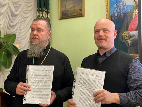 Далее на Чтениях состоялась церемония подписания и обмена Соглашениями о взаимодействии Патриаршего подворья и Автономной некоммерческой организации Центр поддержки и развития патриотического воспитания «Гвардия» в лице директора Старых Андрея Владимировича. Настоятель напомнил, что Патриаршее подворье и АНО ЦПВ «Гвардия» давно связывала совместная работа.