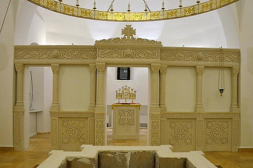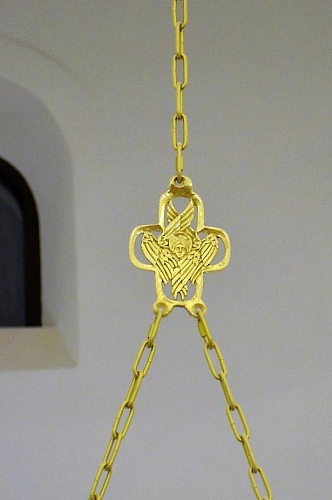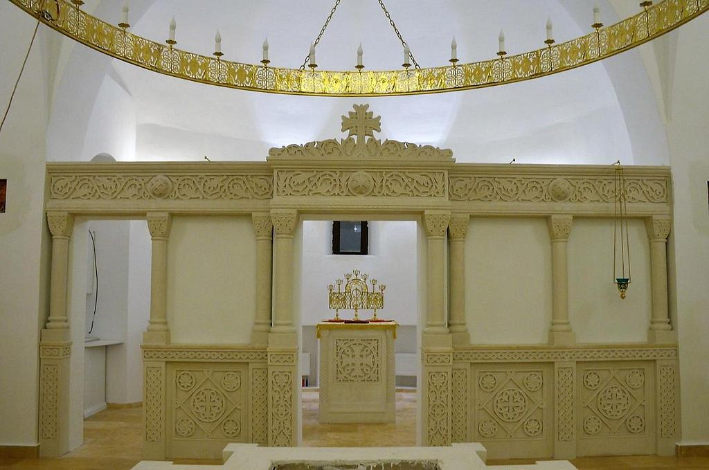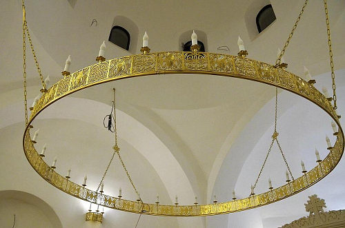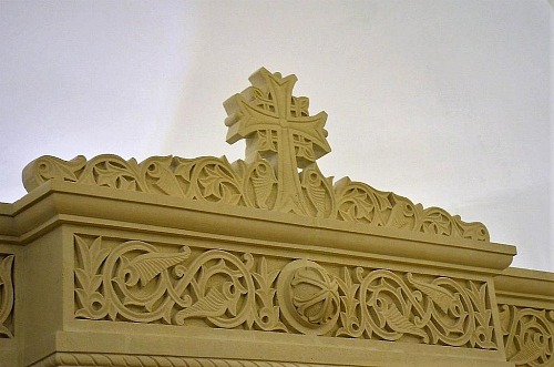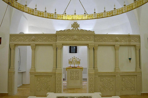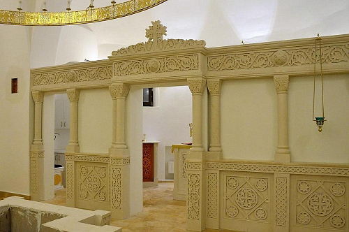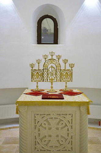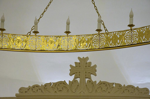 Кроме иконостаса, в храме выложен пол натуральным камнем травертин, установлены хорос и светильники.
