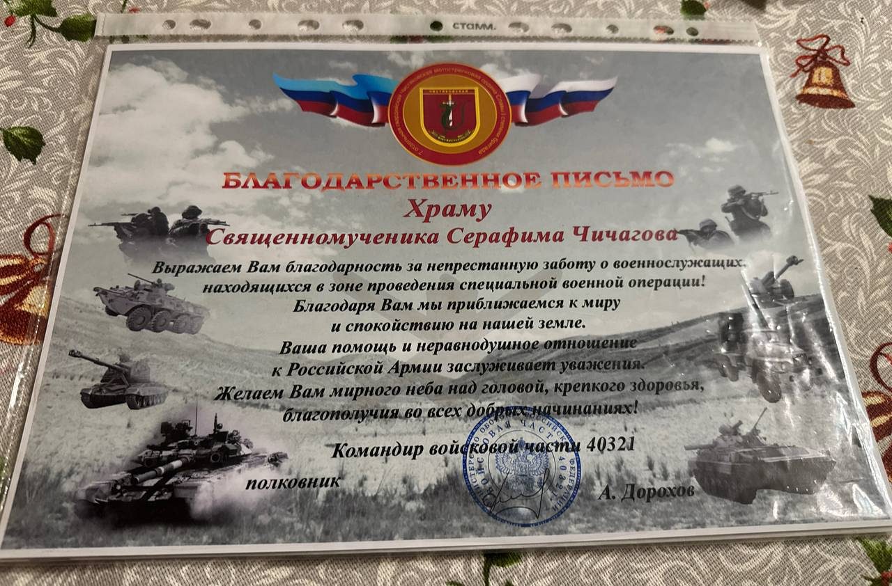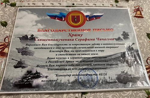 За оказываемую помощь военнослужащим СВО, командир войсковой части 40321, полковник А. Дорохов ранее передал приходу храма сщмч. Серафима, митрополита Петроградского Благодарственное письмо.