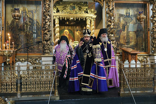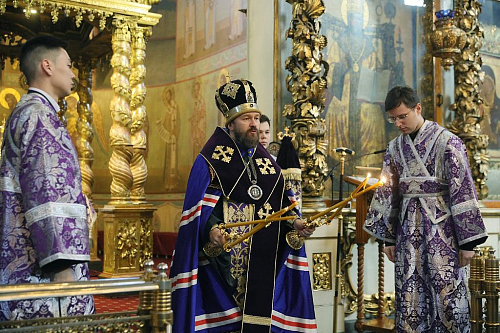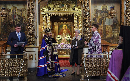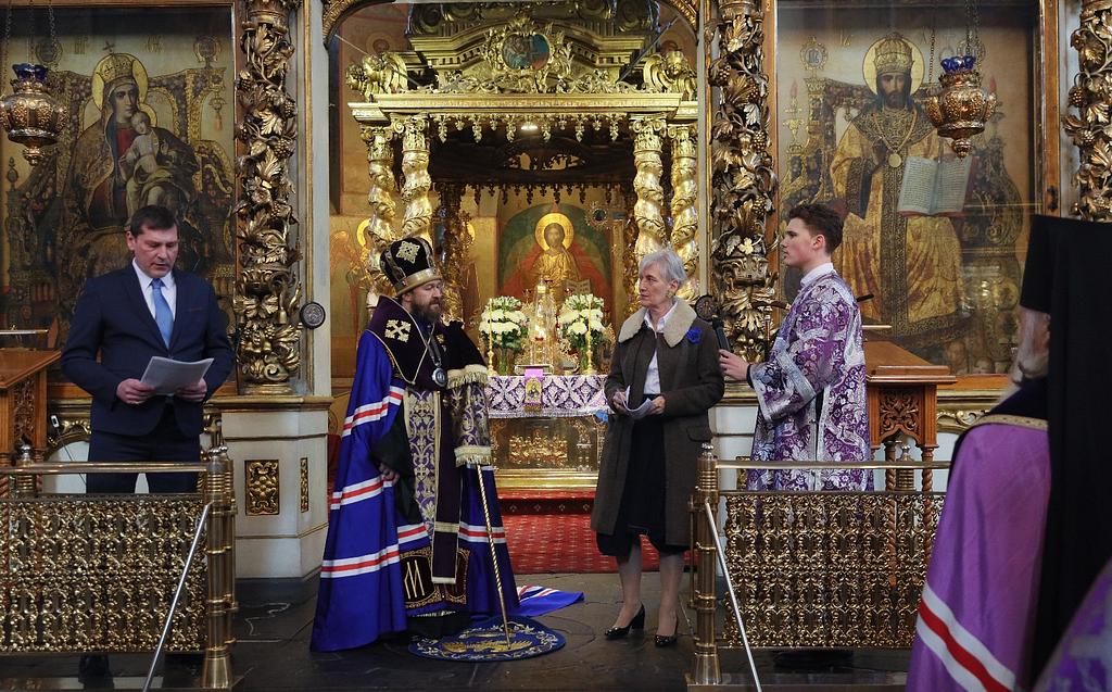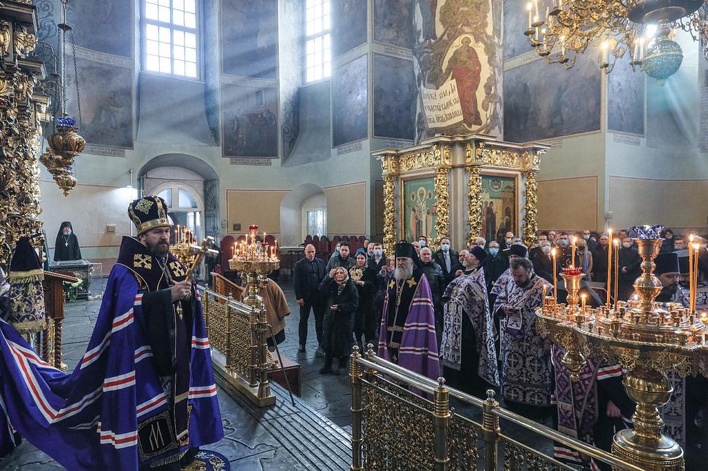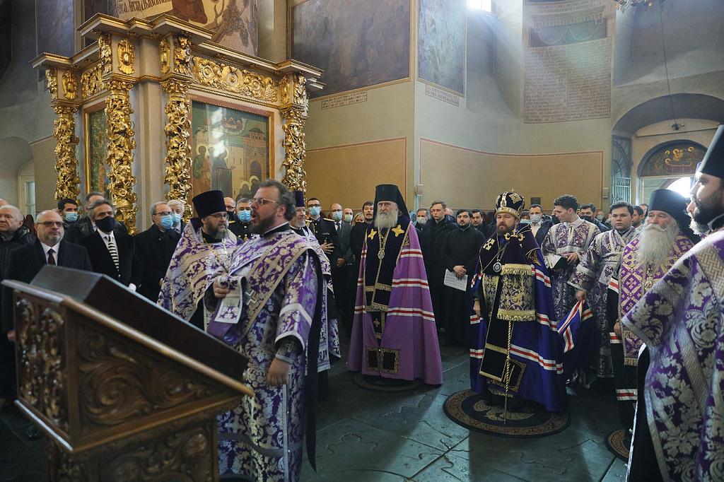 По благословению Святейшего Патриарха Московского и всея Руси Кирилла богослужение возглавил председатель Отдела внешних церковных связей Московского Патриархата митрополит Волоколамский Иларион в сослужении председателя Синодального отдела по монастырям и монашеству, наместника Донского монастыря архиепископа Каширского Феогноста и викария Святейшего Патриарха епископа Дмитровского Феофилакта, а также заместителя председателя ОВЦС протоиерея Николая Балашова, секретаря ОВЦС по межправославным отношениями протоиерея Игоря Якимчука, секретаря ОВЦС по делам дальнего зарубежья протоиерея Сергия Звонарёва.