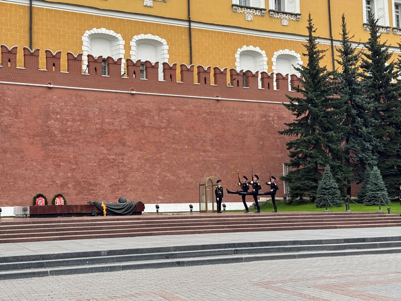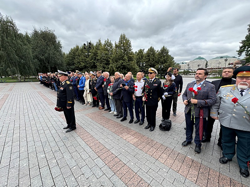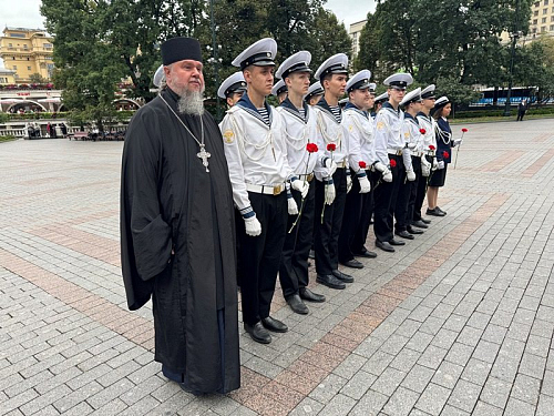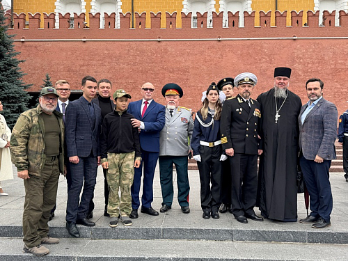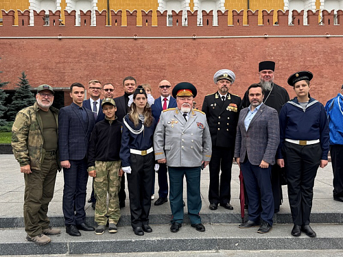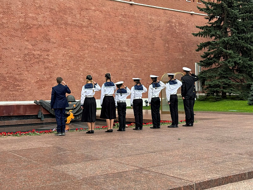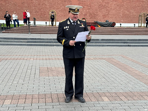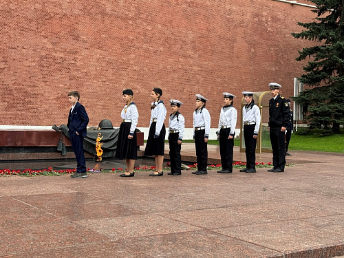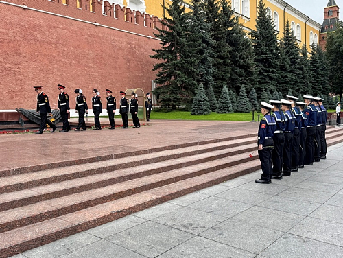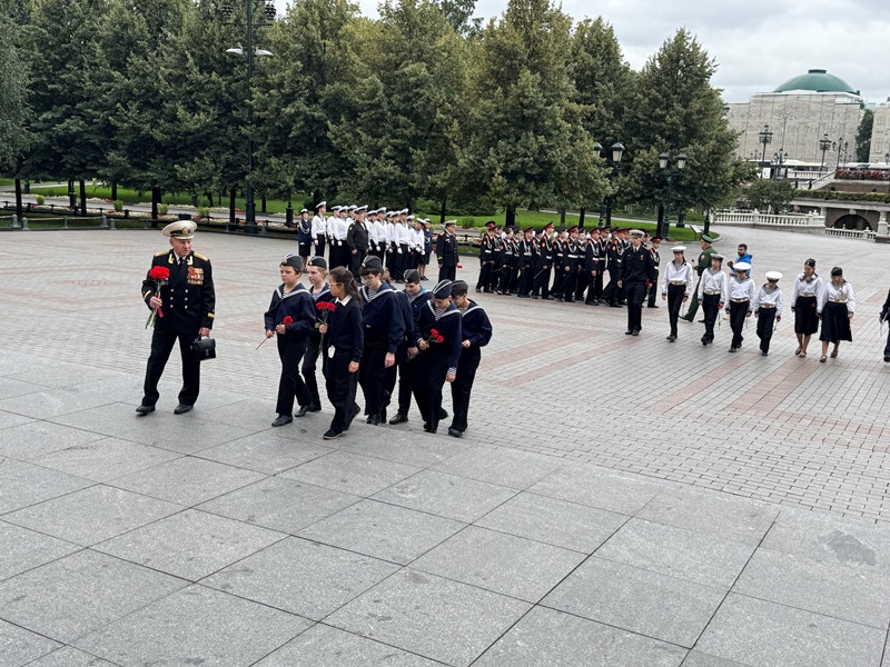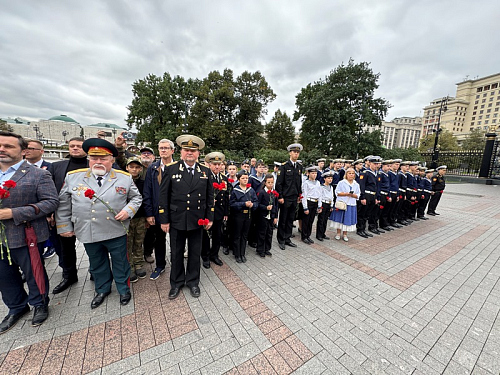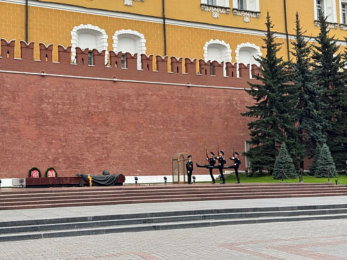 Участники почтили минутой молчания память всех павших воинов отдавших свои жизни защищая наше Священное Отечество и возложили венки и цветы к могиле Неизвестного солдата в Александровском саду в Москве.