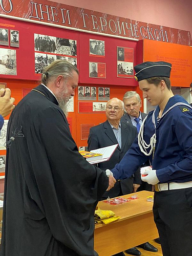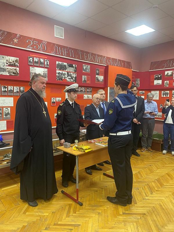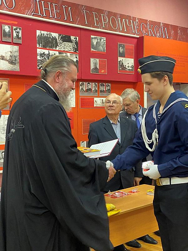 После основного мероприятия Руководитель клуба-музея "Сокольники и Флот" Петр Стефанович Паршиков и Председатель Международного общественного фонда "Командарм" Марк Юрьевич Дейдыш вручил наиболее активным курсантам почетные грамоты и благодарности, а преподавателям, наставникам колледжа, а также активным труженикам на ниве патриотической и воспитательной работы награды. Настоятель игумен Дамиан был удостоен памятного знака "Федор Федорович Ушакова" 2 степени.