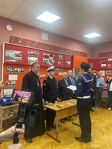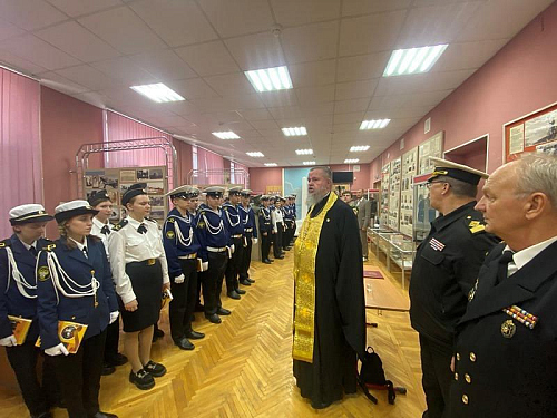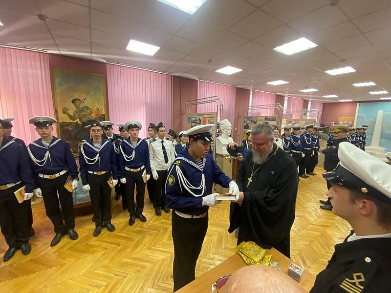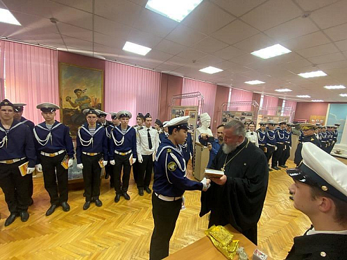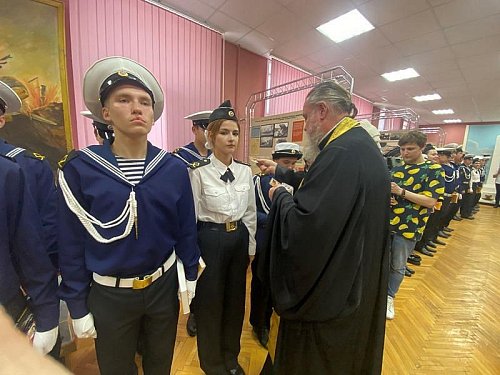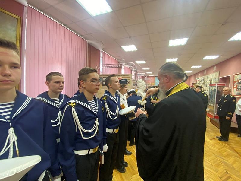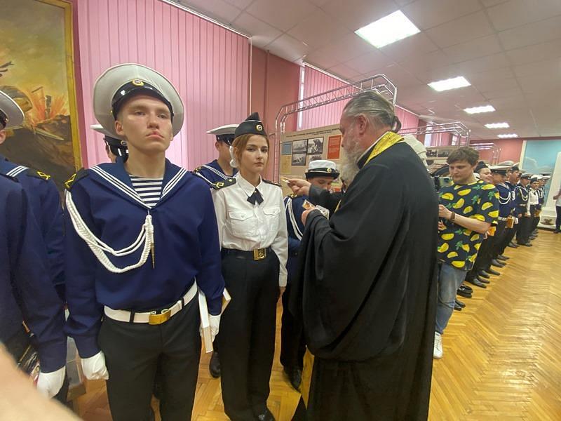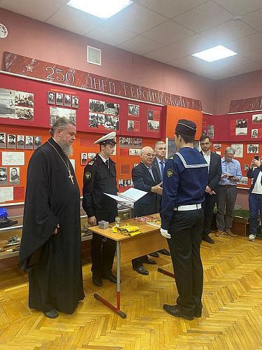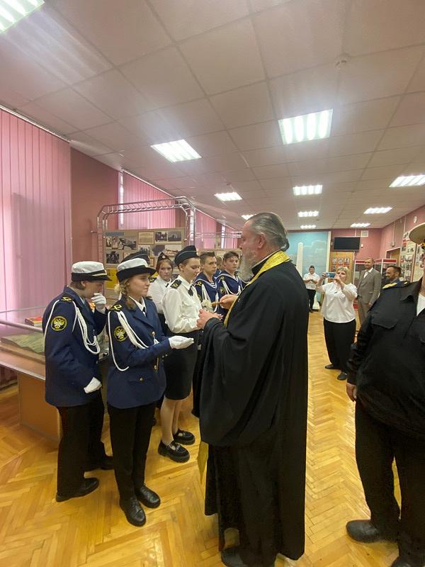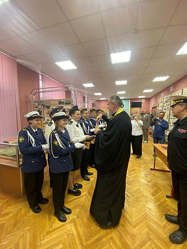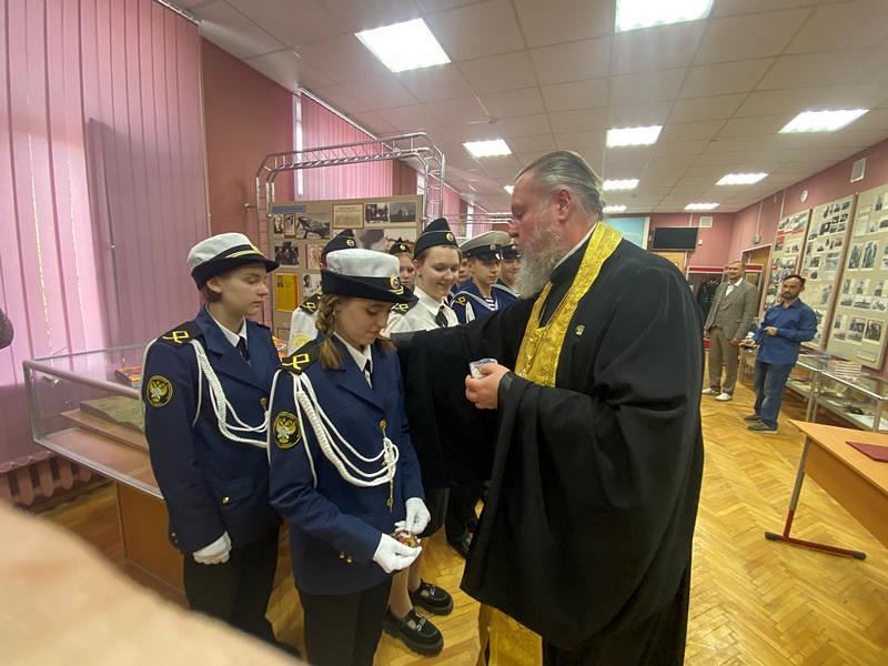После принесения клятвы перед курсантами выступил настоятель храма святого праведного воина Феодора Ушакова в Южном Бутове игумен Дамиан (Залетов). Настоятель приветствовал курсантов, родителей и воспитателей. Он ободрил ребят и пожелал им стал хорошими и дружными людьми. По доброй традиции игумен Дамиан окропил юнармейцев и всех присутствующих Святой водой и подарил каждому иконку святого праведного воина Феодора Ушакова.
