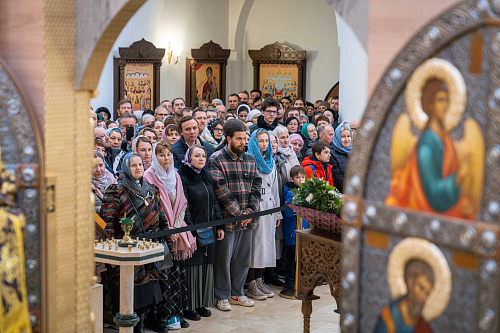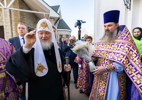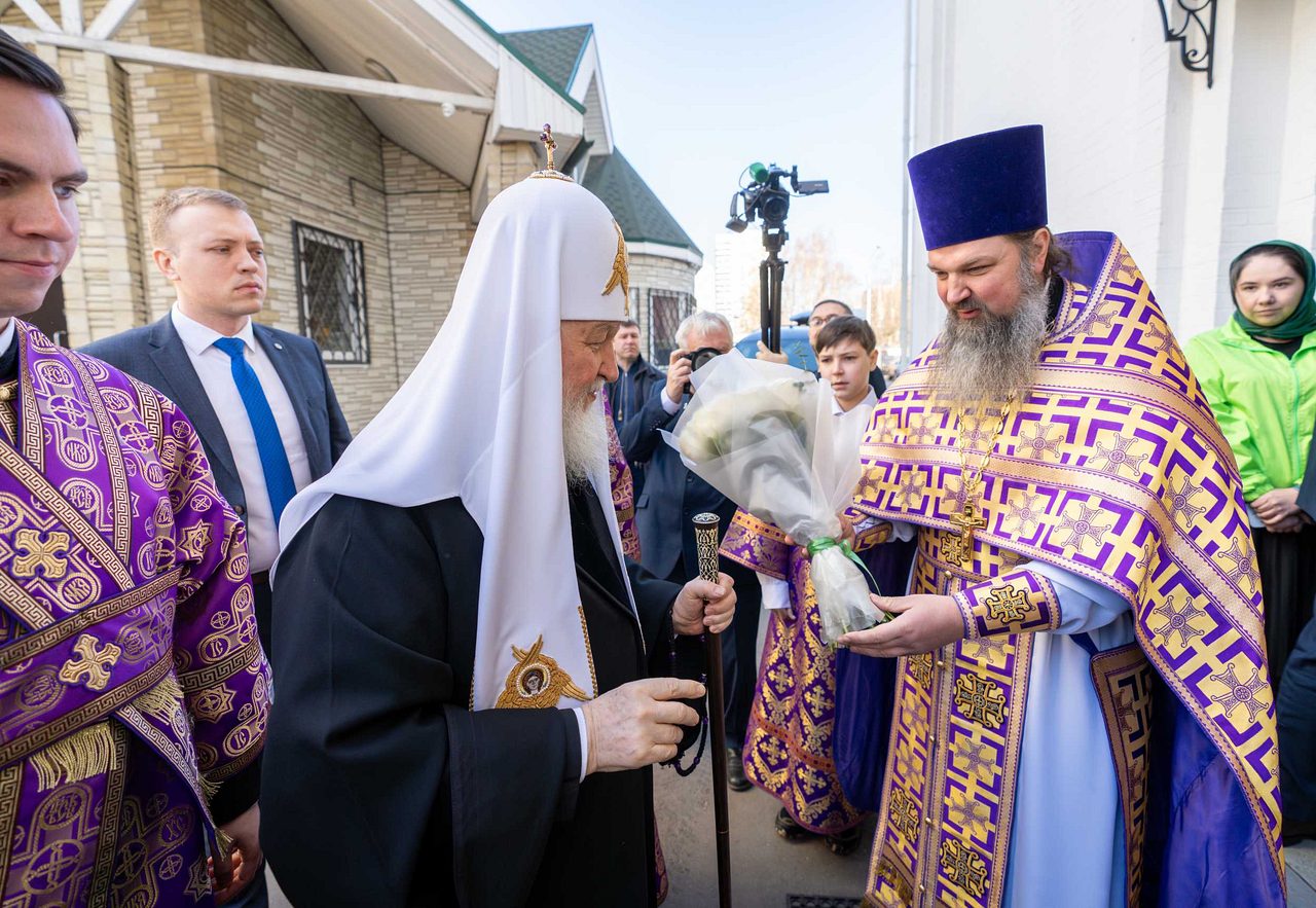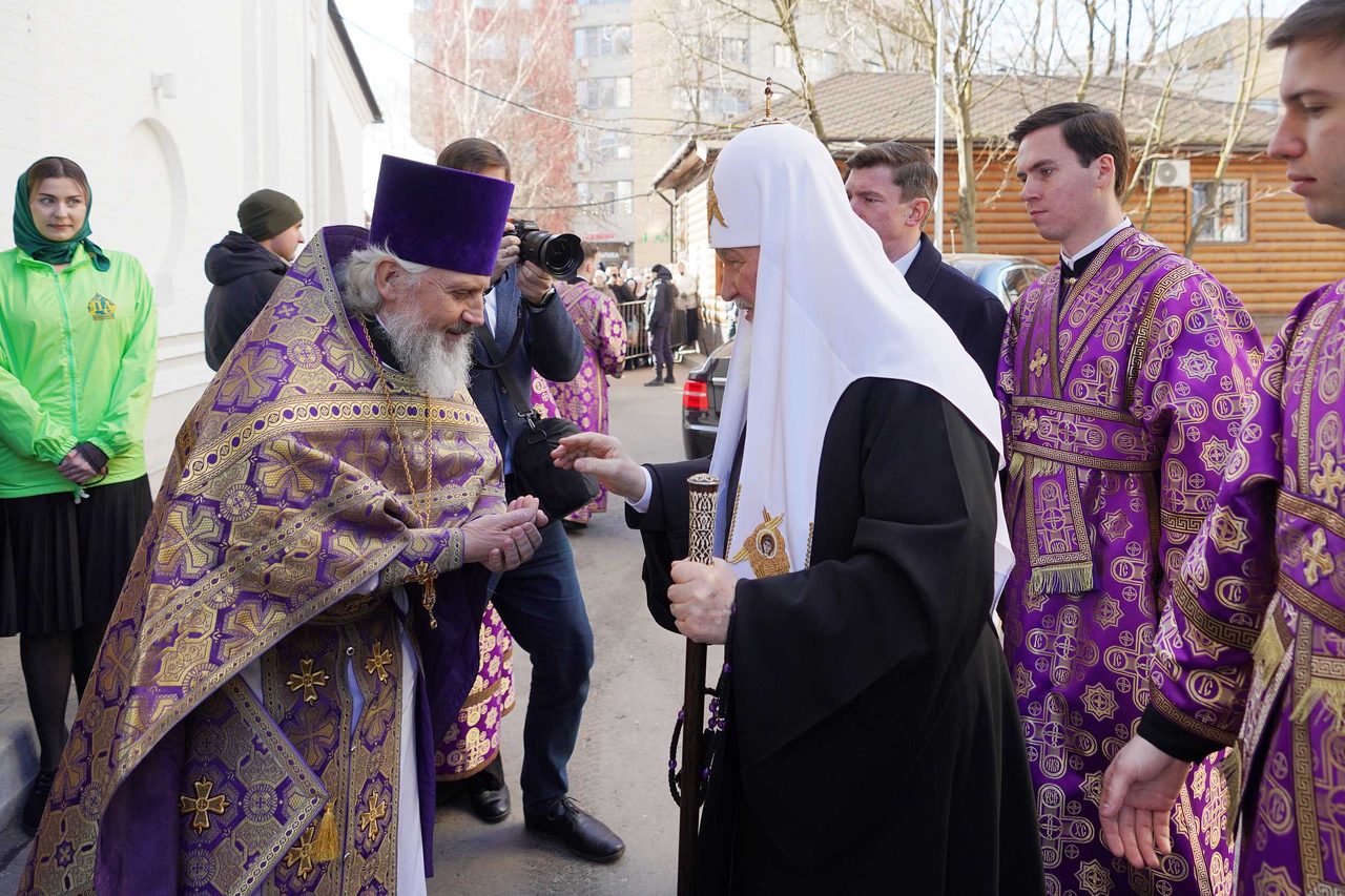 Перед началом богослужения у врат храма Предстоятеля Русской Православной Церкви встречали: протоиерей Николай Карасев, благочинный Андреевского округа, настоятель храма Живоначальной Троицы в Старых Черемушках г. Москвы; иерей Иоанн Омелянчук, настоятель храма священномученика Ермогена в Зюзине г. Москвы.