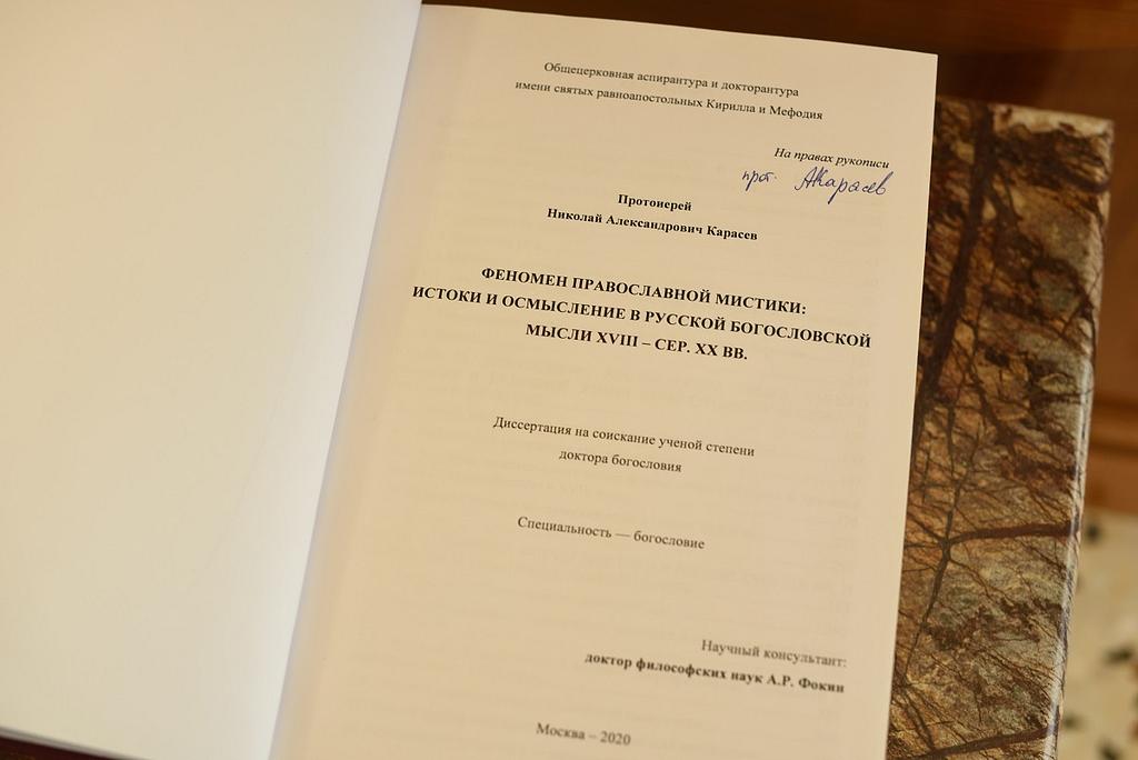 В ходе заседания состоялась защита докторской диссертации благочинного Андреевского церковного округа, настоятеля храма Живоначальной Троицы в Старых Черемушках протоиерея Николая Карасева на тему: «Феномен православной мистики: истоки и осмысление в русской богословской мысли XVIII — сер. XX вв.». Научный консультант диссертанта – доктор философских наук, ведущий научный сотрудник Общецерковной аспирантуры и докторантуры им. святых равноапостольных Кирилла и Мефодия А.Р. Фокин.