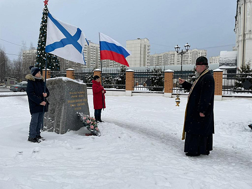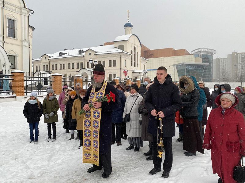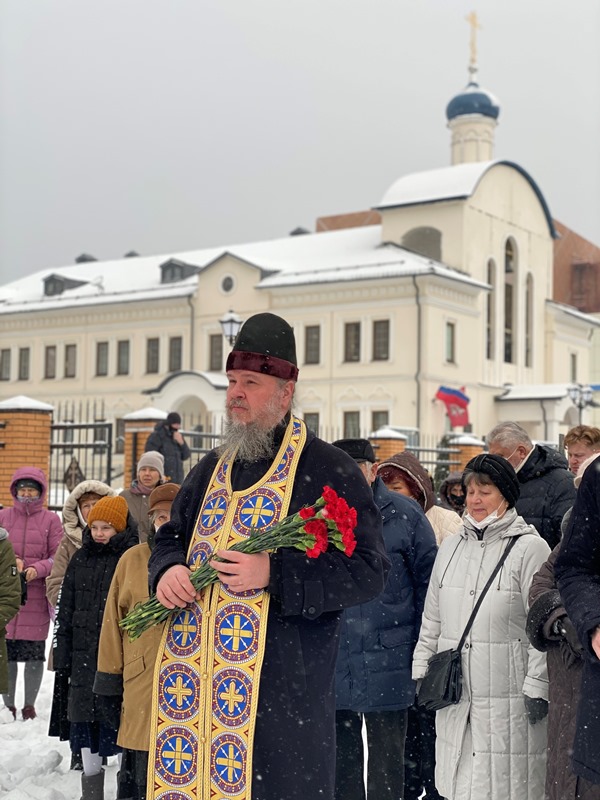 После Богослужения в воинском храме святого праведного воина Феодора Ушакова в Южном Бутове прихожане и гости направились к мемориалу, где настоятель храма игумен Дамиан (Залетов) совершил заупокойную молитву в память погибших воинов и ополченцев, защитниках Столицы в 1941 году и героев России.
