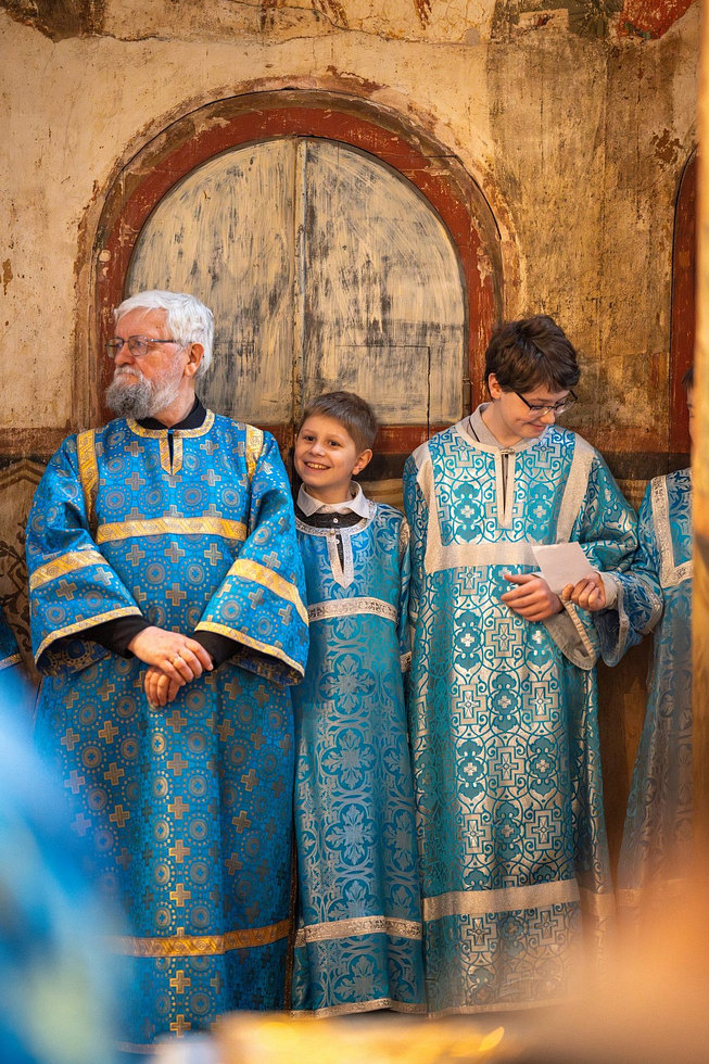 За Литургией в Благовещенском соборе Его Святейшеству сослужили: архиепископ Одинцовский и Красногорский Фома, руководитель Административного секретариата Московской Патриархии, настоятель Богоявленского кафедрального собора г. Москвы; епископ Раменский Алексий, личный секретарь Святейшего Патриарха Кирилла; протопресвитер Владимир Диваков, секретарь Патриарха Московского и всея Руси по г. Москве; протоиерей Вячеслав Шестаков, настоятель храмов Патриаршего подворья в Зарядье г. Москвы, ризничий Патриаршего Успенского собора и храмов Московского Кремля; столичное духовенство.