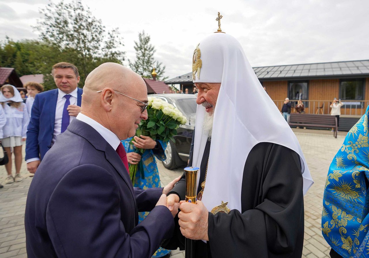Настоятель новоосвященного храма протоиерей Павел Гумеров приветствовал Предстоятеля Русской Церкви и преподнес Его Святейшеству икону благоверных князя Петра и княгини Февронии Муромских.