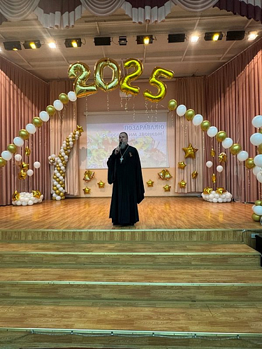 Перед залом выступил игумен Дамиан, который сердечно поздравил выпускников с окончанием школьных занятий и напомнил им о том, что надо беречь время, ведь они поступали в школу еще маленькими детьми, тогда когда храм Святого адмирала еще только начинал строиться, а теперь и храм построен и они выпускники, а все начиналось как будто вчера. Отдельные слова благодарности прозвучали в адрес заместителя директора, руководителя структурного подразделения, Максюты Надежды Ивановны, родителей и учителей. Также игумен Дамиан напомнил выпускникам, что в эти дни празднуется и 80-летие Великой Победы нашего Отечества над фашизмом, он пожелал победы им на выпускных экзаменах и в жизни. Закончил свое слово настоятель пасхальным возгласом: «Христос Воскресе!».