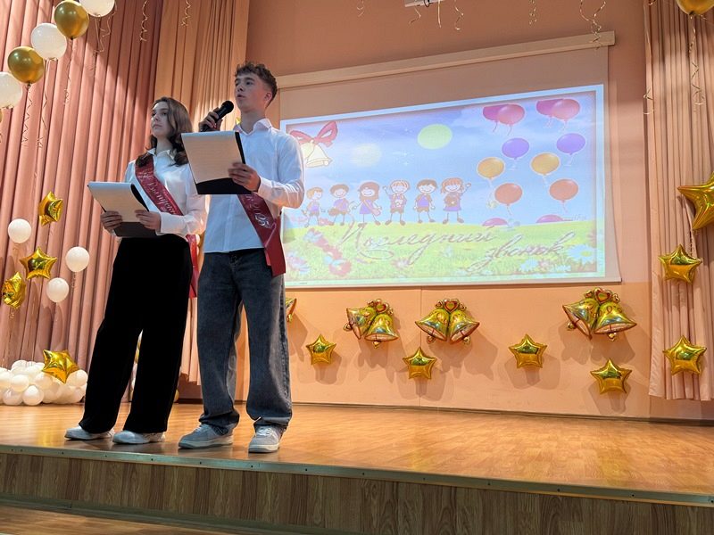 Ребята, ведущие праздничное мероприятие, открыли "Последний звонок", который начался с воспоминаний о прошедших годах учебы.