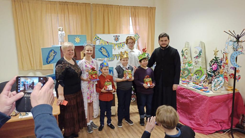В зале была устроена выставка творческих поделок учащихся Воскресной школы.