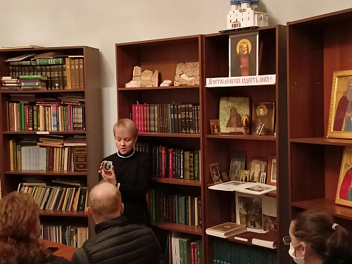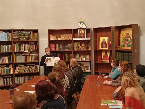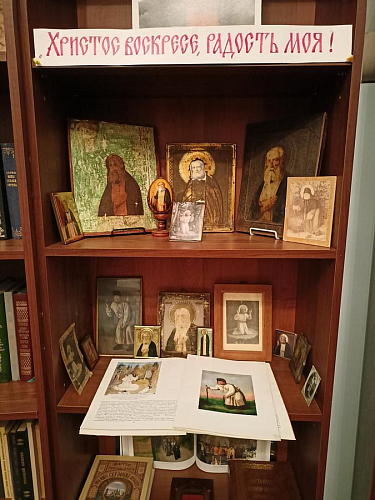 В библиотеке храма была представлена выставка икон преподобного Серафима Саровского. Руководитель школьной иконописной мастерской Островская Алла Викторовна познакомила собравшихся со сложившейся традицией иконописания образа святого.