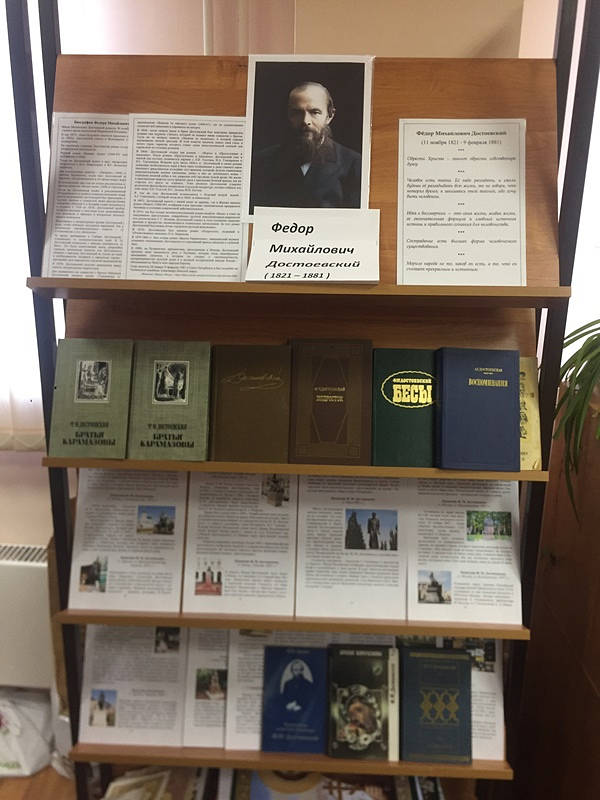 Мероприятие состоялось в библиотеке Дома причта, где заранее был оформлен стенд с информацией об основных жизненных событиях писателя, а также представлены основные романы Ф.М. Достоевского: «Преступление и наказание», «Братья Карамазовы», «Подросток», «Идиот», «Бесы», «Бедные люди» и «Белые ночи».