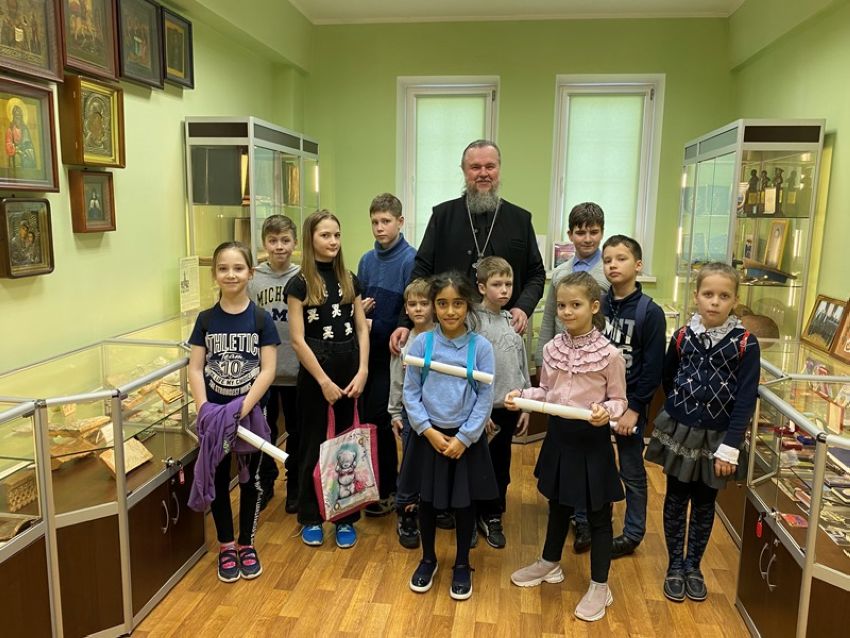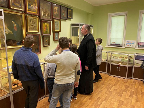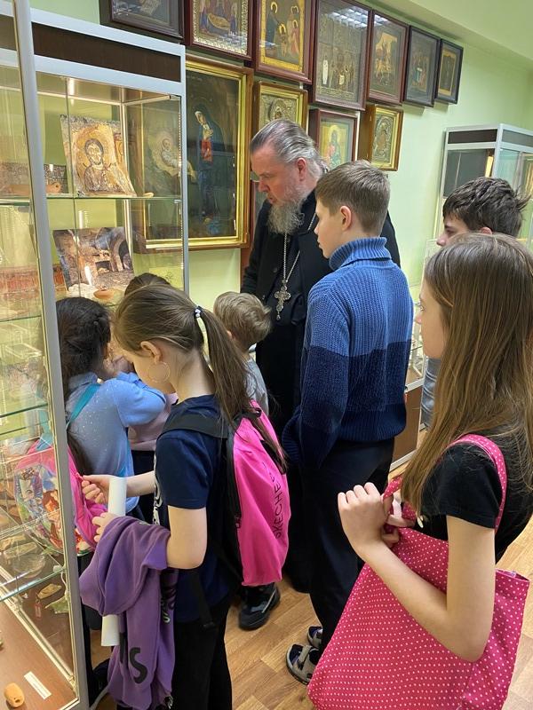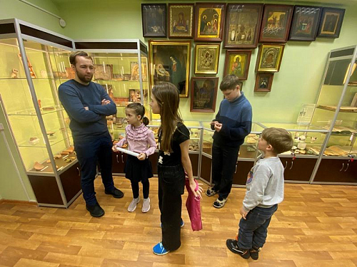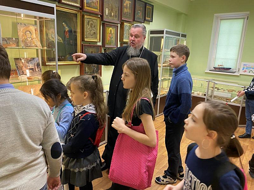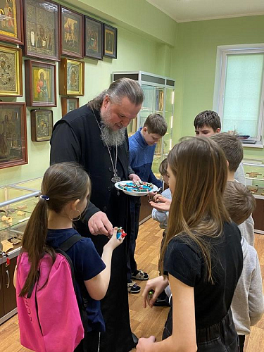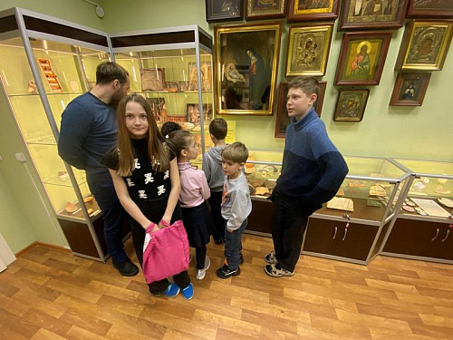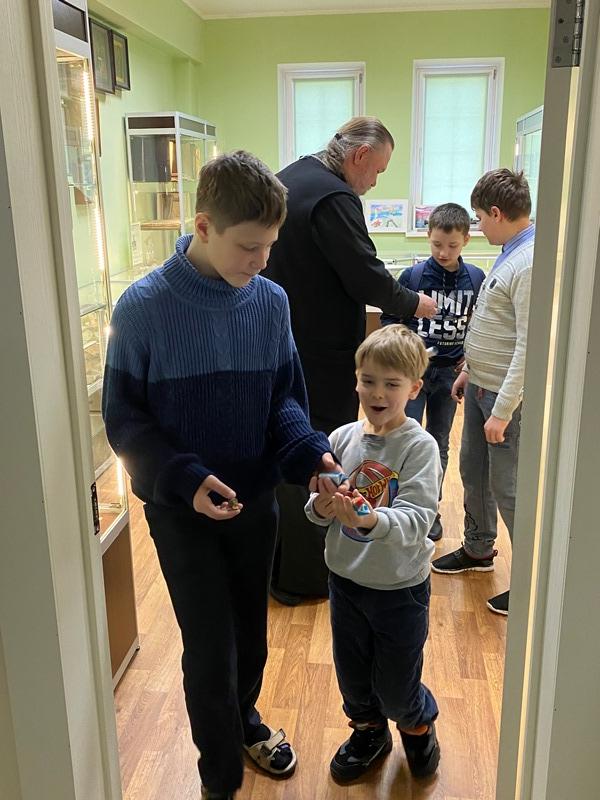 Затем воспитанники Воскресной школы парами проследовали в церковно-археологический музей Патриаршего подворья. Ребятам очень понравился рассказ о древних предметах, о том, как их использовали в прошлом, а когда в конце мероприятия игумен Дамиан угостил их конфетами. После этого все довольные и счастливые отправились домой.