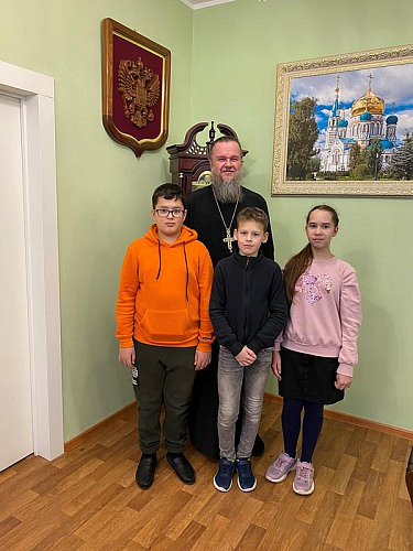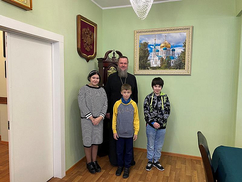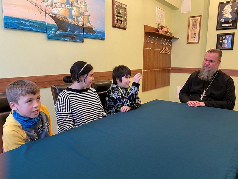 Настоятель рассказал ребятам об особом почитании в России святых апостолов Андрея Первозванного и Симона Канонита. С первым связано учреждение главного ордена России и Андреевского флага. С именем второго апостола связано основание Ново-Афонского монастыря в Абхазии.