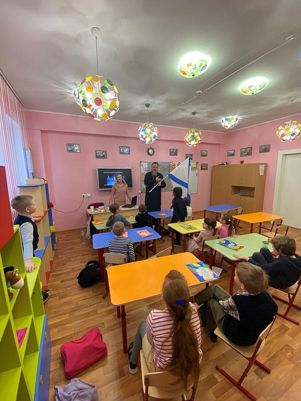 Игумен Дамиан взял с собой Андреевский флаг и посетил ребят в аудиториях дома причта, где проходили уроки. Во время встречи настоятель и ребята разобрались с такими вопросами как: