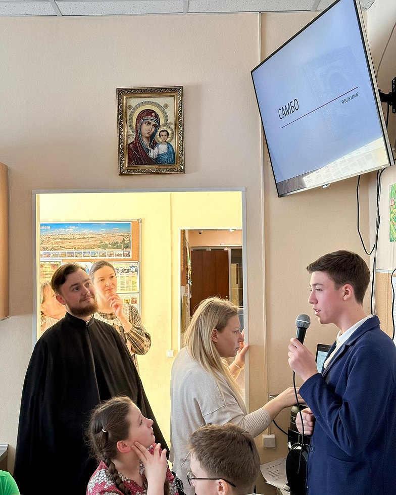 Далее с докладом выступил Макар Рубцов, который в ходе своего выступления рассказал о важности спортивной культуры в жизни человека. Особое внимание было уделено такому виду спорта, как самбо. В своем докладе Макар Рубцов отметил,что создание этого вида спорта было связано с именем святителя Николая Японского и Василия Сергеевича Ощепкова из Сахалина, который, будучи сиротой, прибыл обучаться в семинарию, созданную святителем Николаем.