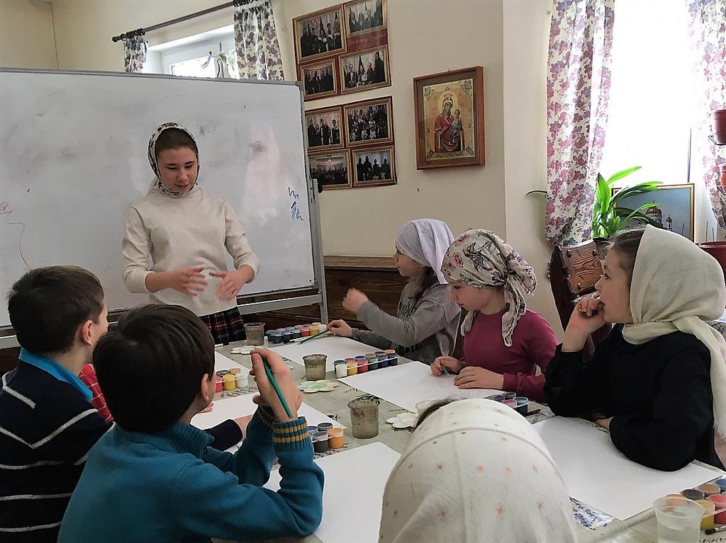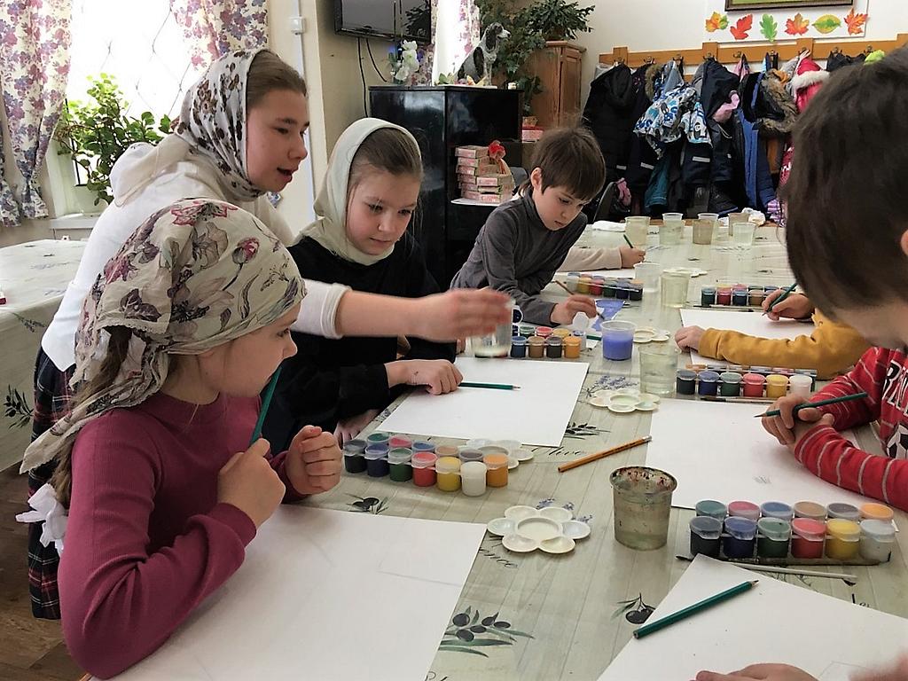 В этот раз творческое занятие провела выпускница Воскресной школы Алексеева Варвара. Не смотря на свой юный возраст, Варя серьезно увлекается живописью. Поэтому в начале занятия она рассказала о правилах расположения листа, жанрах изобразительного искусства, а в процессе занятия направляла ребят и помогала рисовать.