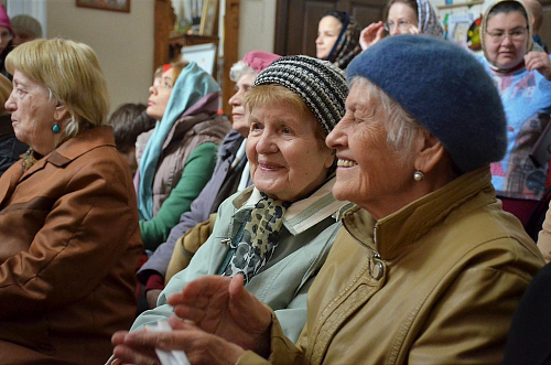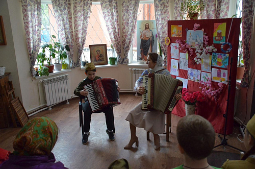Зрители с радостью и вниманием встречали артистов, а в заключение, под аккомпанемент аккордеона в исполнении директора Воскресной школы Екатерины Вадимовны Гришиной, все спели хором любимую всеми песню "Катюша".