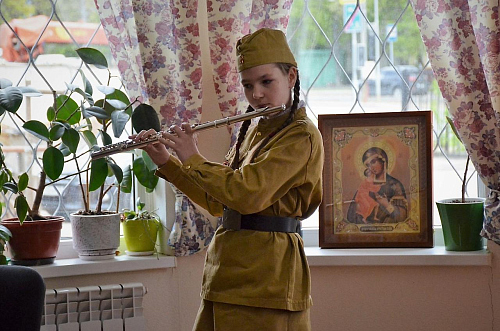 Концерт начался с исполнения песни "День Победы", затем прозвучали русские народные песни и произведения в инструментальном исполнении. Прозвучали стихи и песни военных лет, мелодии известных песен времён Великой Отечественной Войны. Гостем концерта стал член бард-клуба "Своя среда" Ягудин Анатолий Александрович. В его исполнении прозвучали песни Булата Окуджавы и стихи собственного сочинения. Многие зрители слушали выступления, не скрывая слез.