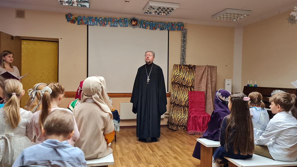 После пения тропаря Рождества Христова духовник школы протоиерей Владимир Кучумов поздравил собравшихся с праздничными днями и отметил, что в эти светлыедни мы приносим свою любовь и таланты в подарок рожденному Богомладенцу.
