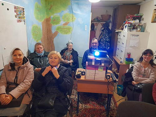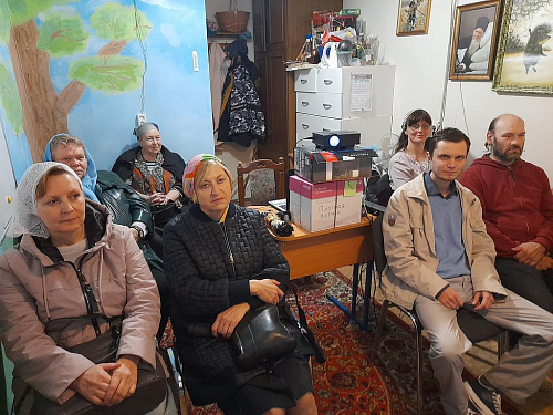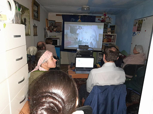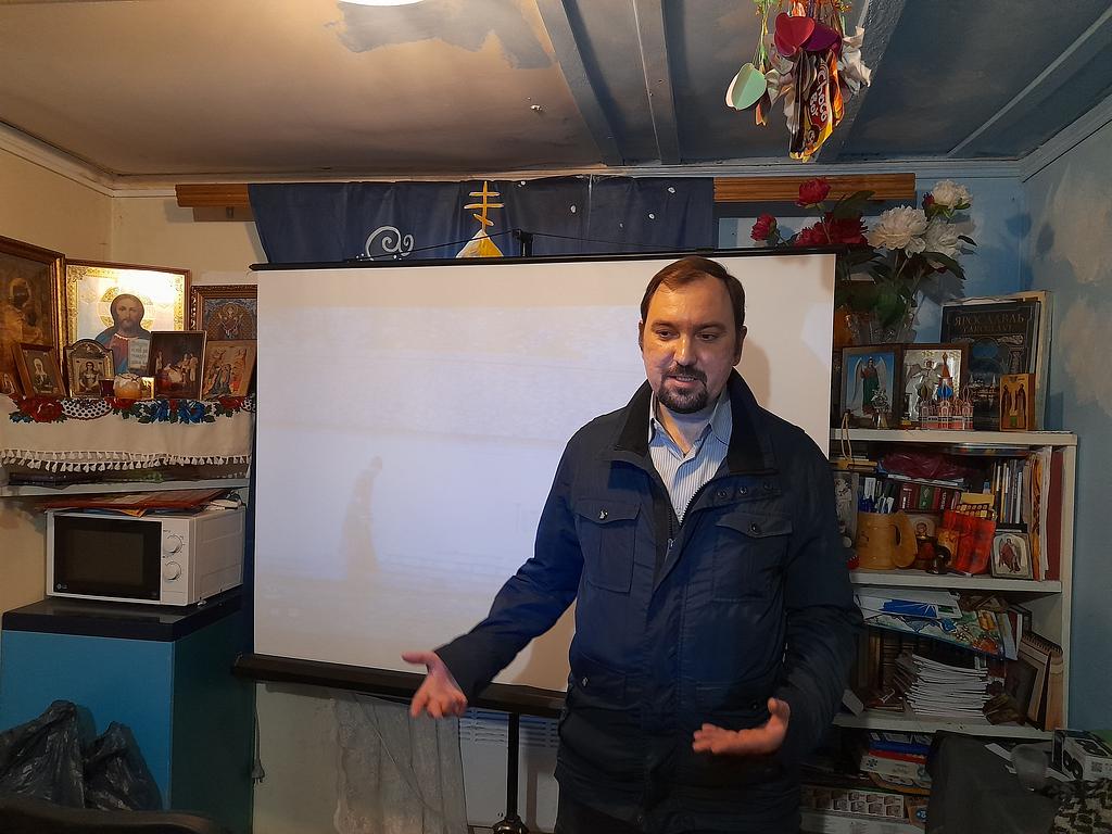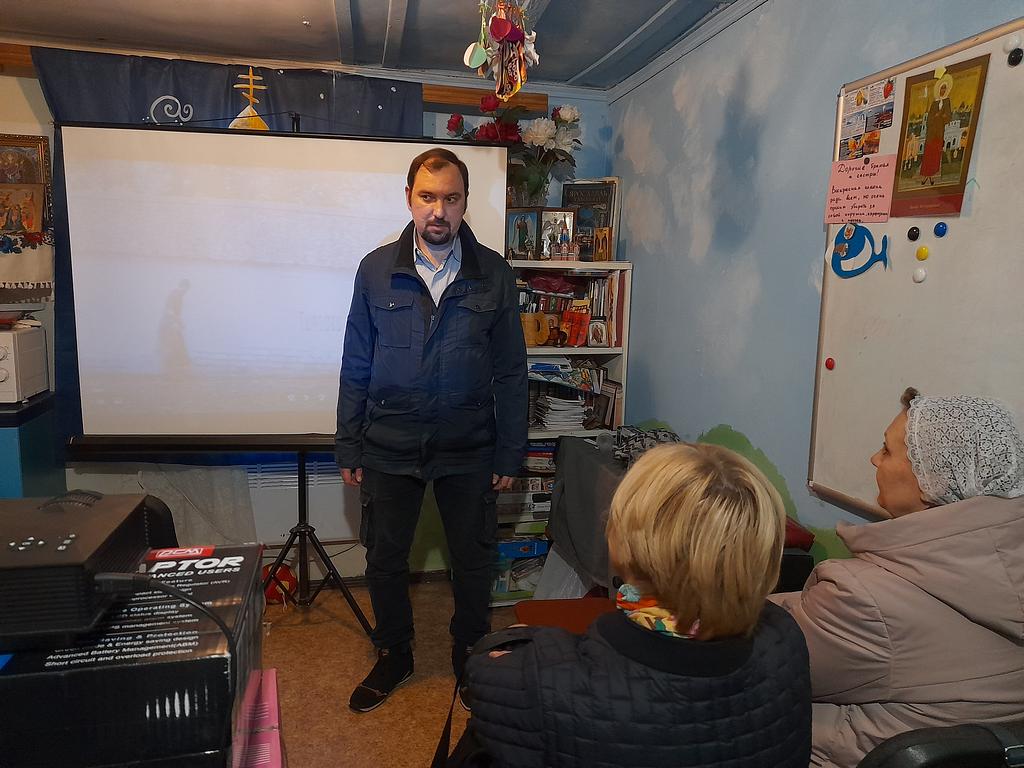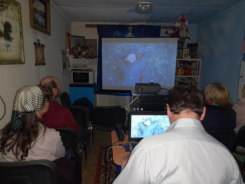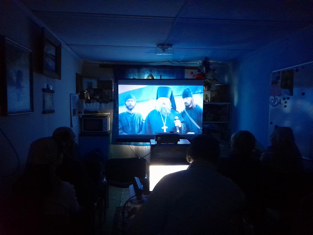 После воскресного богослужения и совместной трапезы прихожане собрались в Воскресной школе. В рамках кинолектория организатор встречи Михаил Погорелов вел показ художественного трагикомедийного фильма «Монах и бес» режиссёра Николая Досталя.