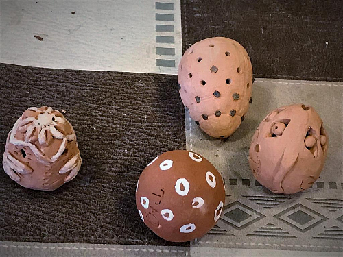 После обжига в печи все игрушки станут прочными, яркими и выразительными. Колокольчики будут звенеть; яйца-погремушки, благодаря шарикам, вложенным внутрь, тоже станут звучащими.