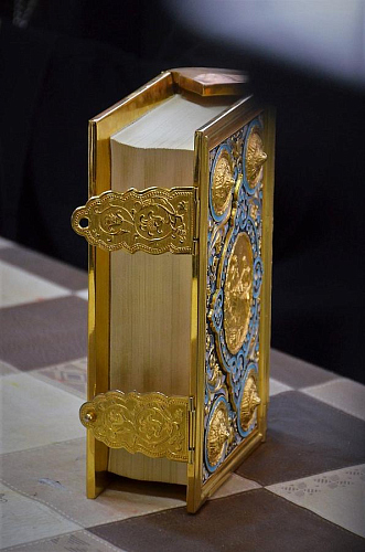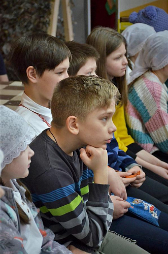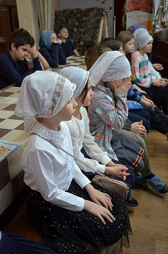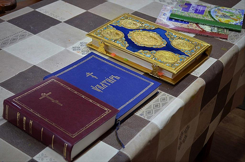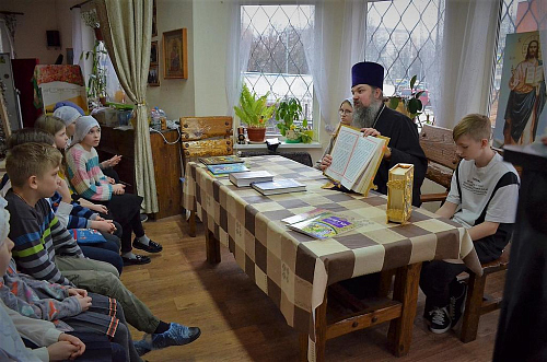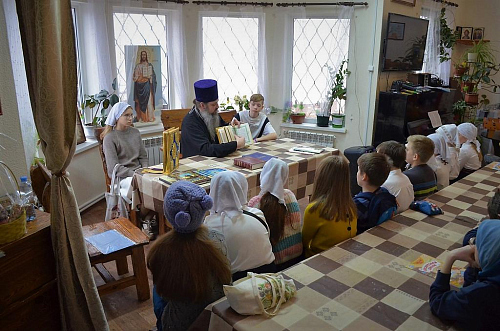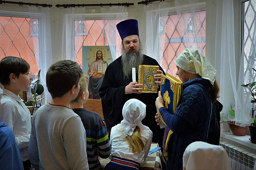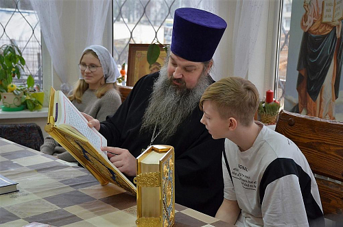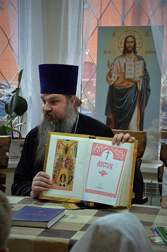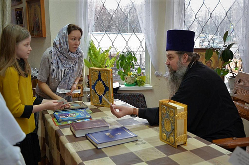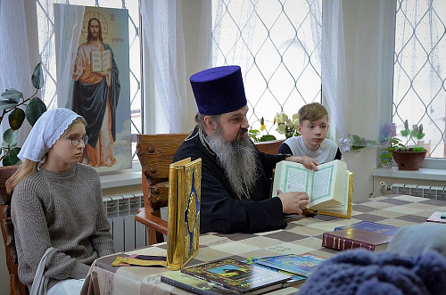 В беседе с учащимися Воскресной школы настоятель храма иерей Иоанн показал ребятам книги Апостол и Святое Евангелие, которые выносятся из алтаря на Богослужениях. Сначала дети рассмотрели книгу Апостол, иерей Иоанн рассказал порядок и правила чтения глав из книги, объяснил, в какой части Литургии прочитываются отрывки. Ребята с увлечением слушали рассказ, задавали вопросы.
