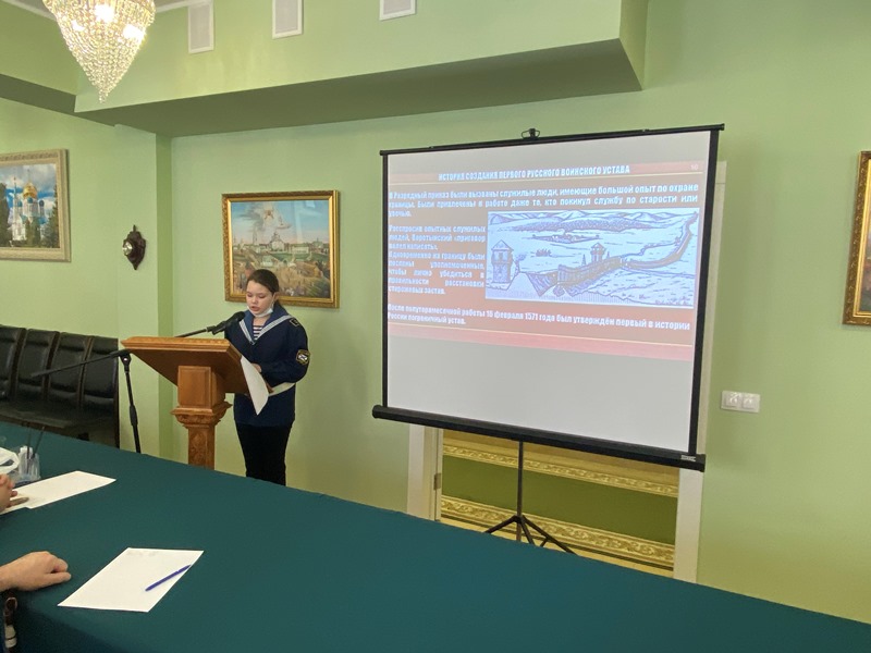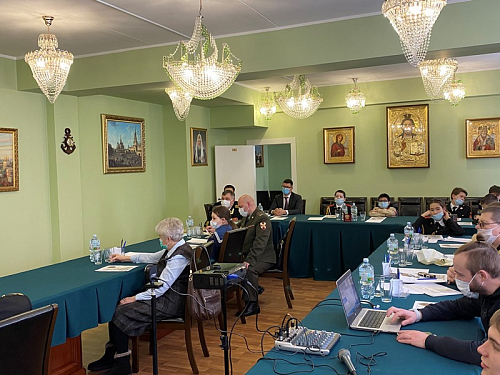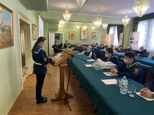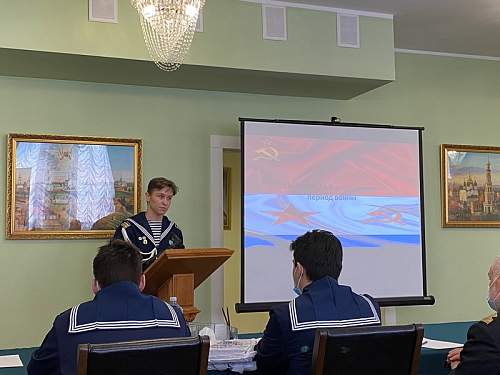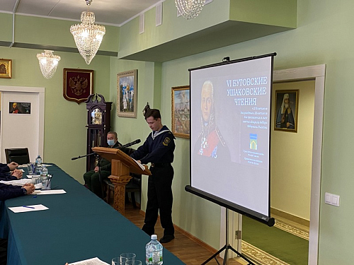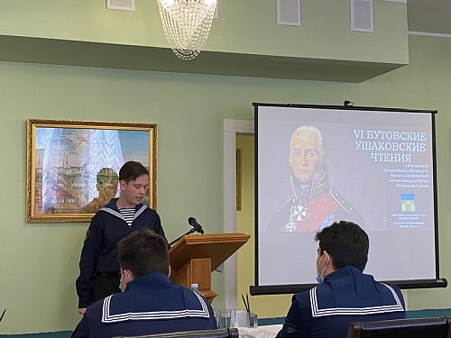 В этом году основные доклады конференции, подготовленные обучающимися бутовских школ и колледжа, были посвящены памятным и знаменательным датам русского флота. К. Миронова (Школа № 1883 «Бутово») рассказал о первом русском воинском уставе, который был принят в нашей стране ровно 450 лет назад. Доклад А. Краснеевой (Школа № 1981) был посвящен истории Балтийского флота, которому в этом году исполняется 320 лет. Балтийскую тему продолжил З. Афанасьев (ГБОУ Школа № 1161), представивший историю Балтийского флота в начальный период Великой Отечественной войны 1941-1945 гг.». Яркое выступление курсанта колледжа АВТ РУТ (МИИТ) И. Штыкова было посвящено юным защитникам первой обороны Севастополя. А завершающим докладчиком стала Д. Смирнова (Воскресная школа), которая рассказала о жизни и судьбе святого адмирала Ф. Ушакова, а также о том, что в 2021 году исполняется 20 лет со дня прославления адмирала Ушакова в лике святых Русской Православной Церкви.