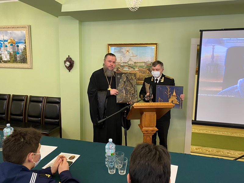 Краеведческо-экологическое общество «Бутово» и Музей морской истории России имени адмирала Ф.Ф. Ушакова (ГБОУ Школа № 1161) в присутствии участников Ушаковских чтений передали в дар создаваемому церковно-краеведческому музею храма святого праведного воина Феодора Ушакова два панно, принадлежавших почетному жителю района Южное Бутово, контр-адмиралу, Владимиру Павловичу Макарову, именем которого назван Навигацкий класс Подворья.