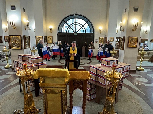 Перед молитвой они собрались в доме причта Патриаршего подворья и дружно собрали посылки, куда включили необходимые вещи и продукты для воинов, в том числе и по их просьбе и заказу. Работами руководила организатор волонтерской работы Ирина Игошина.