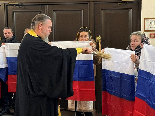Настоятель окропил флаги и посылки перед образом Святого адмирала Святой водой и обратился к присутствующим с призывом молиться о наших воинах и оказывать им постоянную помощь и поддержку. Игумен Дамиан напомнил, что празднование Дня защитника Отечетва совпадает с днем рождения непобедимого адмирала Флота Российского Феодора Феодоровича Ушакова, которому в 2025 году исполняется 280 лет. Настоятель тепло поблагодарил тружениво-добровольцев за их нестанный труд для наших воинов.