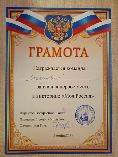 10 ноября 2024 года команда из числа воспитанников Свято-Стефановской воскресной школы заняла первое место в викторине «Моя Россия», посвященной Дню народного единства. Мероприятие организовано директором и педагогами воскресной школы при храме святого праведного Федора Ушакова по благословению настоятеля храма игумена Дамиана (Залетова). К участию были приглашены воспитанники воскресных и общеобразовательных школ района.