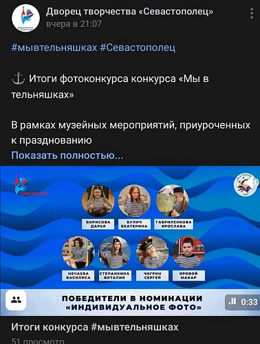 13 ноября 2021 года подведены итоги фотоконкурса конкурса «Мы в тельняшках» в рамках музейных мероприятий, приуроченных к празднованию 325-й годовщины создания Российского регулярного военного флота, Дворец творчества детей и молодёжи «Севастополец» организовал фотоконкурс «Мы в тельняшках».