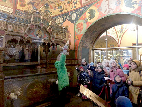 Во время экскурсии ребята узнали об истории постройки этого грандиозного собора, познакомились с его архитектурой и внутренним убранством, а также приложились к чудотворным иконам и раке, в которой под спудом покоятся мощи святого Василия Блаженного. Все с большой радостью помолились в этом святом месте и порадовались чудесному внутреннему благолепию и внешней красоте этого собора.