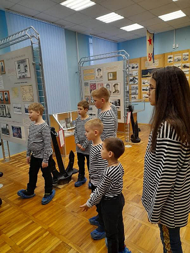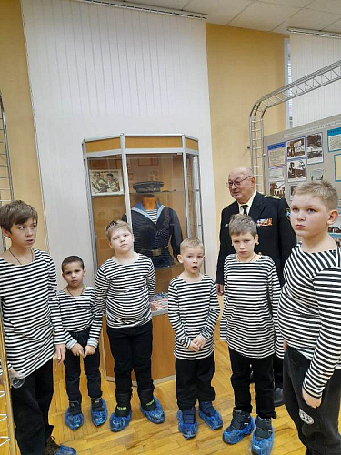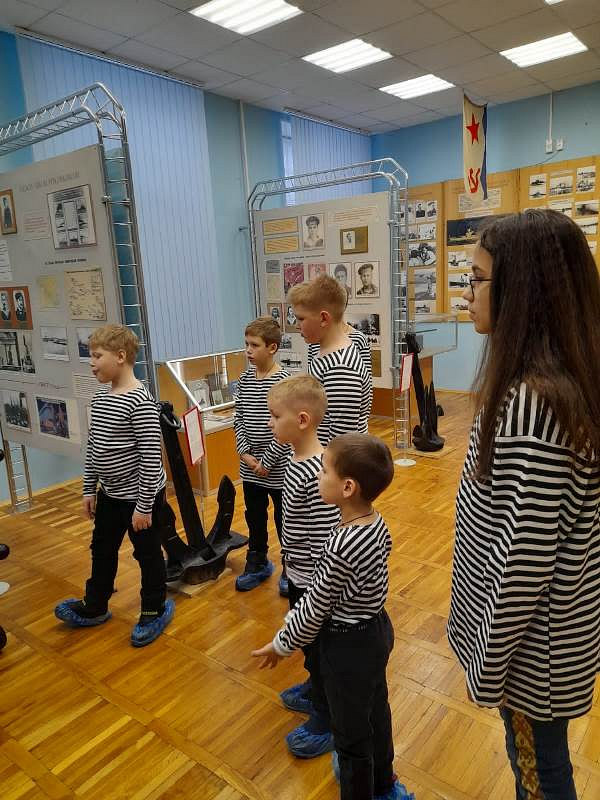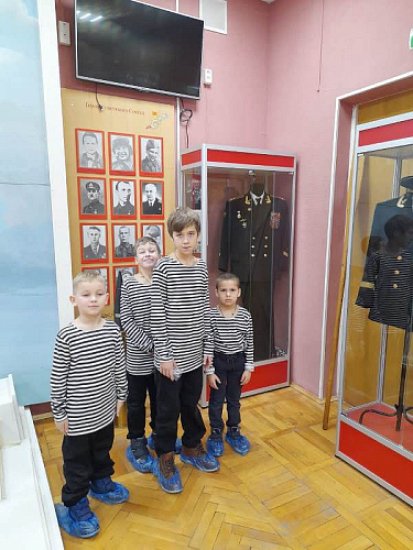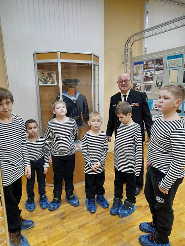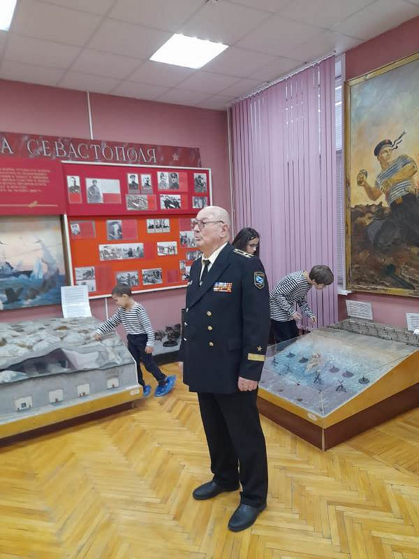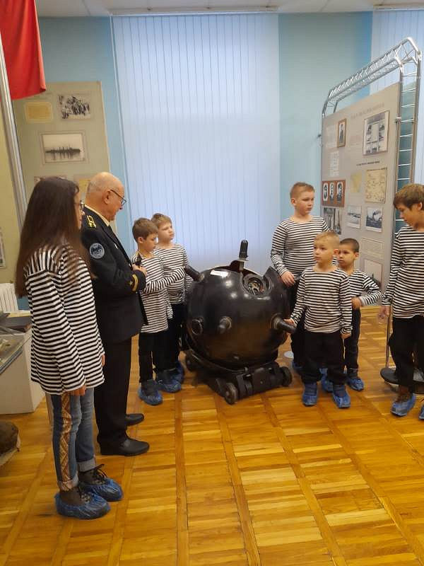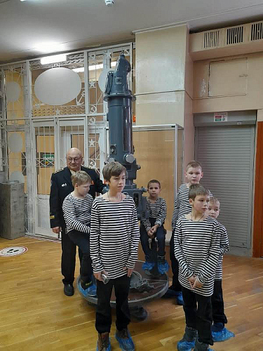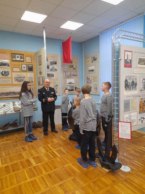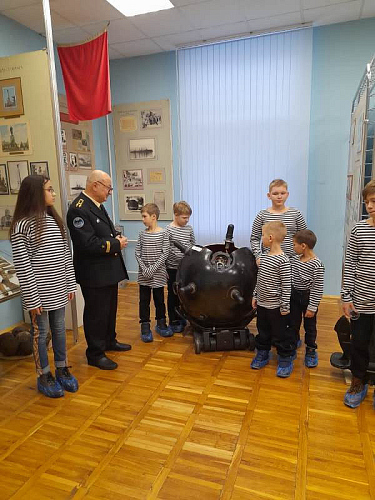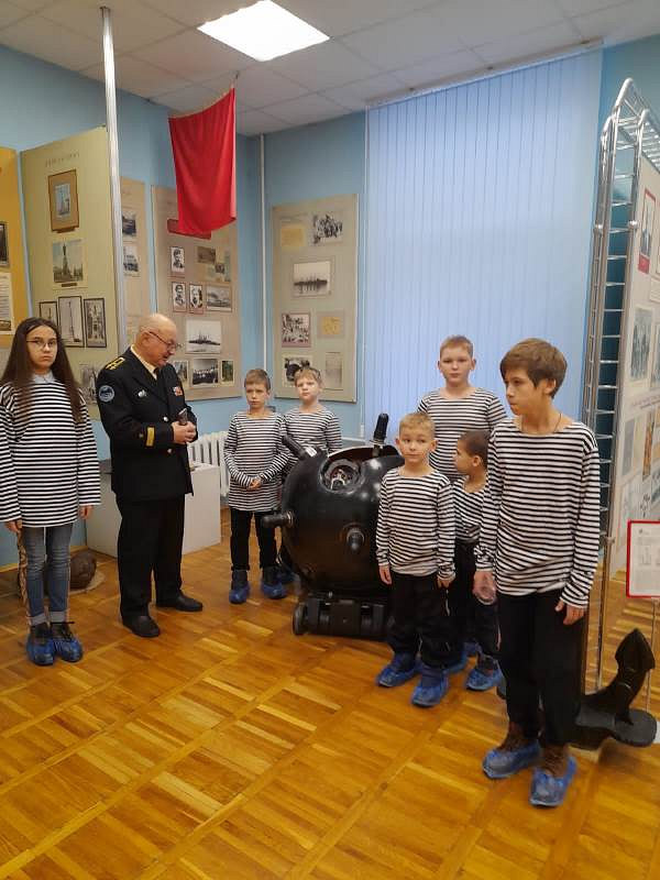 С рассказами об истории тельняшки, жизни и службе военных моряков, а также об экспозициях Музея по его залам детей провел член Совета ветеранов Черноморского флота капитан 1 ранга Александр Яковлев. Ребята могли не только послушать или посмотреть экспонаты музея, но и с интересом потрогать многие удивительные экспонаты, настоящие детали и механизмы морских судов.