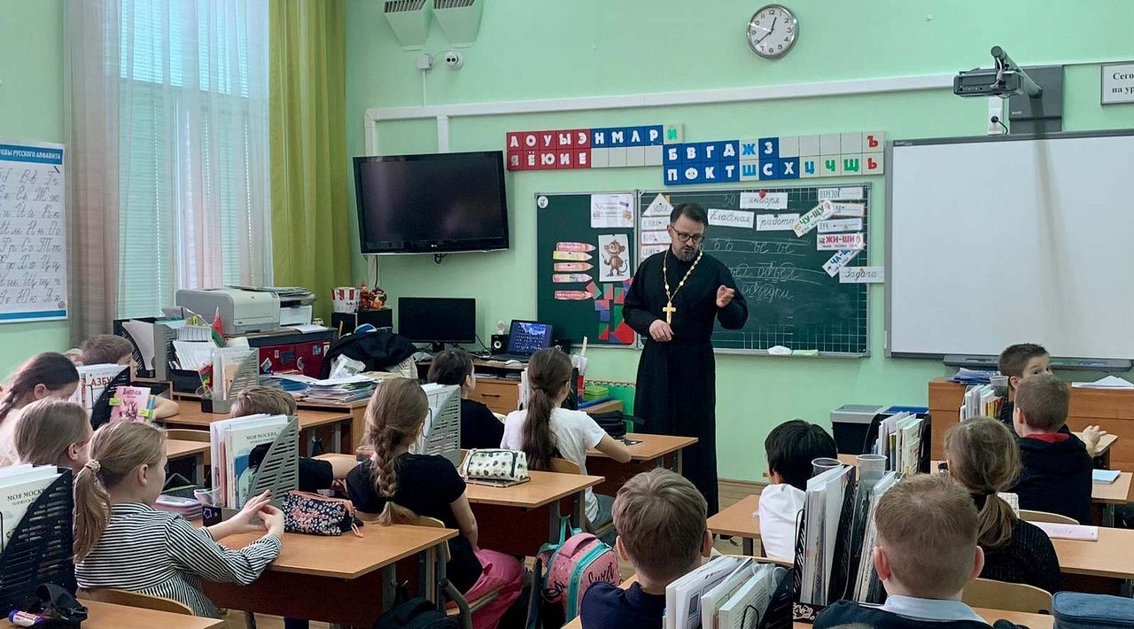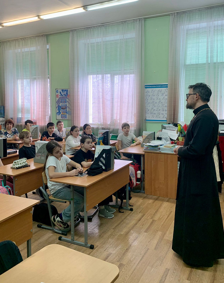 30 января 2025 года по благословению и.о. настоятеля храма Великомученицы Анастасии Узорешительницы в Тёплом Стане иерея Димитрия Борсука и по приглашению учителя начальных классов ГБОУ «Школы № 1101» Джуманиязовой О.К. иерей Стефан Даниленко и общественный методист Слободяник М.М. встретились с учениками 4 класса.