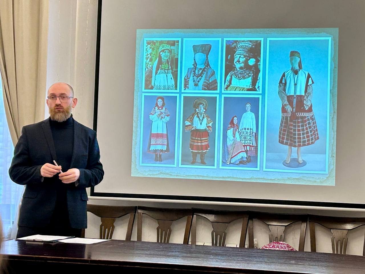 Свой рассказ докладчик иллюстрировал историческим фотоматериалом и фотографиями экспонатов собранной им коллекции народных костюмов.