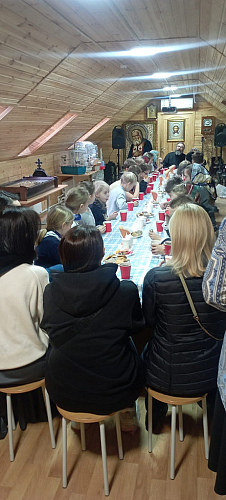 По окончании экскурсии все поднялись на второй этаж воскресной школы, где всех ждали чай и вкусные угощения. И тут наша встреча продолжилась в вопросах к отцу Николаю, дети узнавали много их интересующего, так, например, «Почему девочки в храм ходят в платочках?», «Для чего колокольный звон?» и т.д.