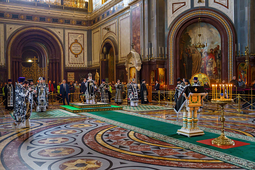За Литургией Его Святейшеству сослужили: митрополит Воскресенский Григорий, управляющий делами Московской Патриархии, первый викарий Патриарха Московского и всея Руси по г. Москве; епископ Раменский Алексий, личный секретарь Святейшего Патриарха Кирилла; протоиерей Михаил Рязанцев, ключарь Храма Христа Спасителя; московское духовенство.