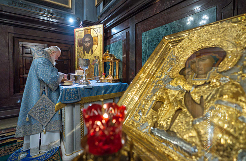 По прибытии в Храм Христа Спасителя Предстоятель Русской Православной Церкви поклонился честным мощам святителя Филарета, митрополита Московского.