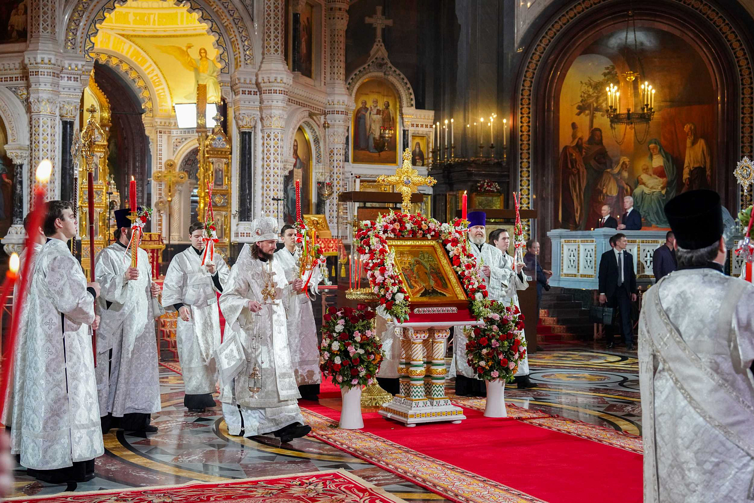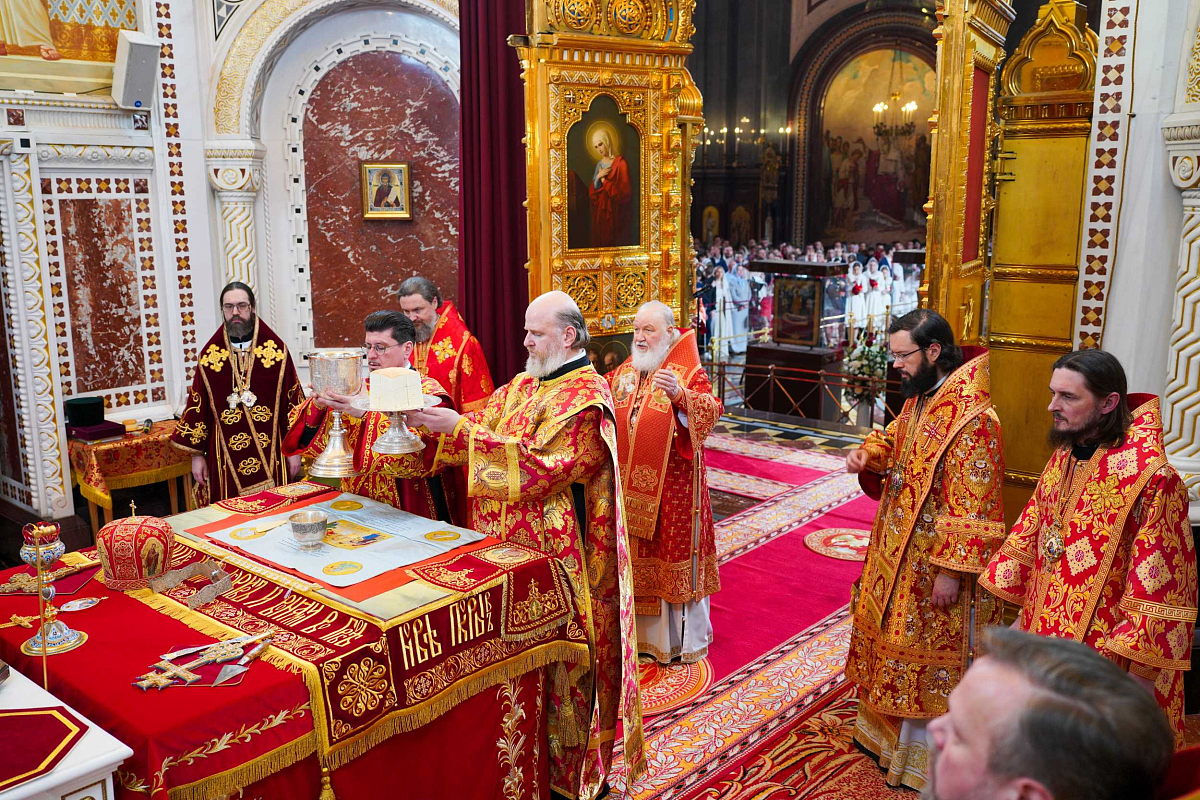 Затем Святейший Владыка рассказал о состоявшейся передаче Церкви чудотворных Владимирской и Донской икон Божией Матери: «В преддверии праздника Входа Господня в Иерусалим совершилось событие исторического значения. При содействии Президента Российской Федерации Владимира Владимировича Путина, присутствующего сегодня вместе с нами на Пасхальном богослужении, состоялась передача Русской Православной Церкви из Государственной Третьяковской галереи великих святынь — наиболее почитаемых на Руси чудотворных икон — Владимирской и Донской икон Божией Матери. Две самые почитаемые иконы возвращены Церкви и сегодня они находятся здесь, в кафедральном соборном Храме Христа Спасителя города Москвы».