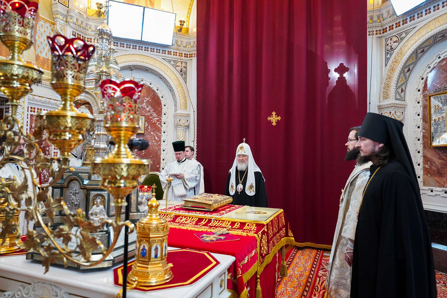 Его Святейшеству сослужили: митрополит Воскресенский Григорий, управляющий делами Московской Патриархии, первый викарий Патриарха Московского и всея Руси по г. Москве; митрополит Волоколамский Антоний, председатель Отдела внешних церковных связей Московского Патриархата; архиепископ Зеленоградский Савва, председатель Синодального миссионерского отдела, заместитель управляющего делами Московской Патриархии; епископ Раменский Алексий, личный секретарь Святейшего Патриарха Кирилла; протоиерей Михаил Рязанцев, ключарь Храма Христа Спасителя; духовенство г. Москвы.